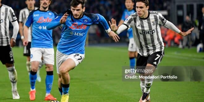Khvicha Kvaratskhelia of SSC Napoli and Federico Chiesa of Juventus FC during the Serie A football match between SSC Napoli and Juventus FC at Diego Armando Maradona stadium. Napoli (Italy), January 13th, 2023. (Photo by Elianto/Mondadori Portfolio via Getty Images)